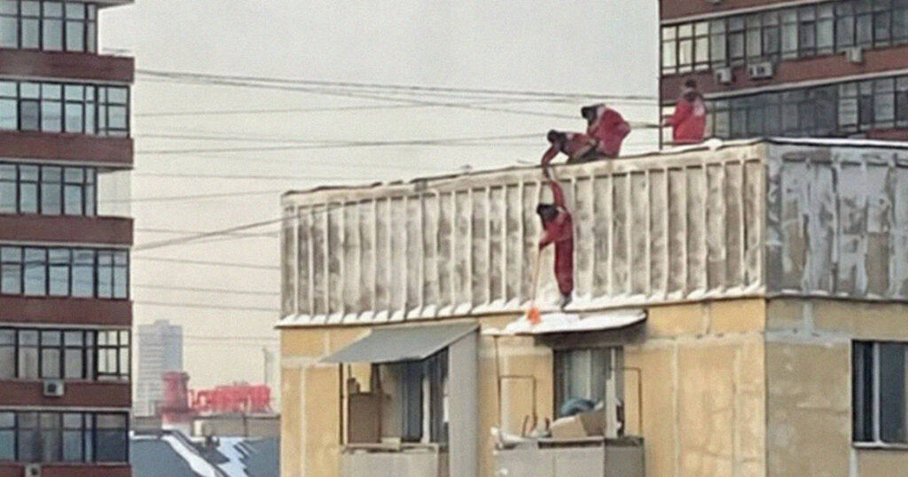 Сюжет такой: на крыше несколько коммунальщиков в оранжевой форме, один перелез через парапет и стоит на узком пространстве прямо над козырьком балкона, опасно балансируя, и метелкой аккуратно счищает снег. Двое наверху страхуют его буквально руками — держат почти за мизинчик. Ни тросов, ни страховки не видно. Высота приличная.
