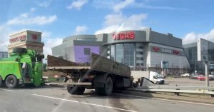 Возле «Крокус Экспо» с внешней стороны МКАД произошла серьезная авария: легковушка столкнулась с грузовой машиной, в результате чего последнюю выбросило на парковку. Фура резко отклонилась от курса и пробила отбойник, остановившись на газоне между парковкой и трассой.
