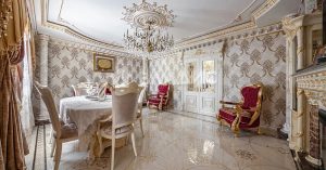 Массивные люстры, лепнина, колонны, витражи и много-много золота — от всего этого рябит в глазах, но со временем, наверное, можно привыкнуть. В детской неожиданно обнаруживается фреска с Дамбо, Маугли и Балу, ради которой пришлось пожертвовать классической стилистикой. Но даже в гостиной, если приглядеться, заметны элементы хай-тека — ярко-синяя подсветка в нише на потолке.
