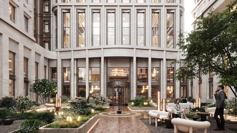 Внутри еще запроектирован закрытый двор, он изображен на отдельном рендере. Пространство собираются сделать максимально камерным: низкие кустарники, небольшие деревья, мягкие диваны и даже круглая чаша с огнем — все для роскошной жизни как в дорогом отеле.