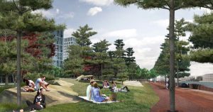 Как и парк «Тюфелева роща», набережная Марка Шагала обещает быть чем-то нездешним: фонтаны, скульптуры, тысяча деревьев, а насыпные холмы будут защищать от ветра.