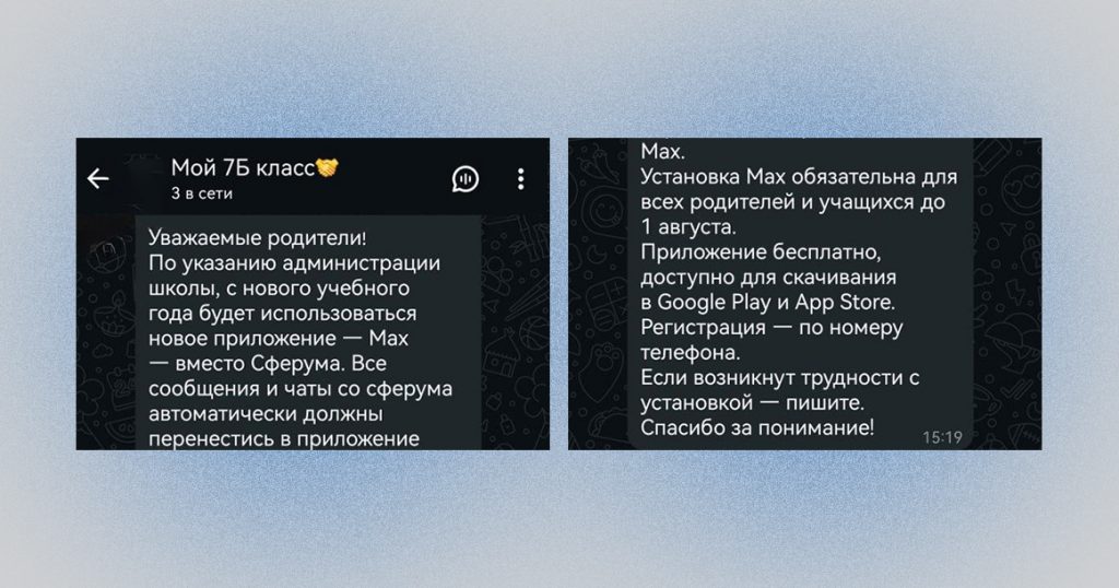 Сообщения появляются в родительских чатах: в них говорится, что установка Max обязательна и должна быть завершена до 1 августа. Представители учебных заведений говорят, что все чаты и сообщения со «Сферума» будут перенесены автоматически.