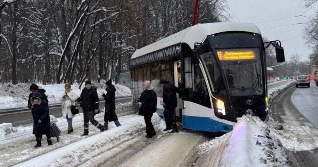 Фото опубликовало агентство «Москва»: вагон остановился под углом к путям, уткнувшись передней частью в снежный вал (конечно, не Миусская дюна, но высота тоже солидная). Двери открыты, пассажиры без паники выходят на проезжую часть и переходят пути пешком прямо по снегу.