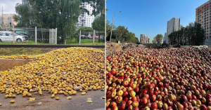 Началось все еще вчера, рядом с солнцевским ЖК «Лучи» на Производственной улице — там вывалили полный КамАЗ частично испорченных яблок, о чем немедленно написал паблик «Ново-Переделкино», а за ним и прочие соцсети.