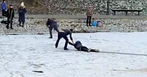 В соцсетях опубликовали видео, на котором двое мужчин, лежа на животе, пытаются достать ребенка из воды. Еще на одном видео мужчина осторожно тащит по льду ребенка к берегу.