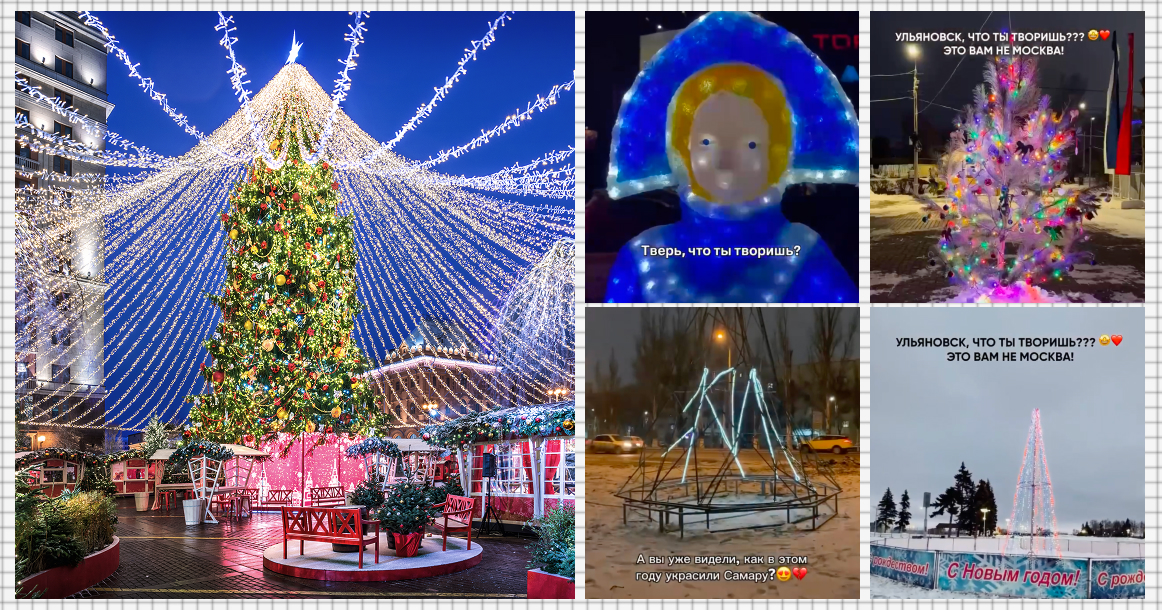 В других регионах траты на украшения еще меньше. В соцсетях набирают популярность вирусные видео «Что ты творишь?» — ироничная версия тренда, где люди приезжают в Москву и восхищаются всем подряд: чистотой, украшениями, сервисом — словом, всем без исключения. Жители регионов пытаются повторить такую же реакцию у себя, но чаще это заканчивается фиаско. К Новому году жителей Петрозаводска, Твери, Самары, Ульяновска и других городов встречают голые елки (как будто их кто-то обгрыз), грязные смешарики из мишуры, странные металлические объекты, обтянутые украшениями, или, как в Королеве, сиротливые гирлянды на три с половиной лампочки в витринах. (Тут стоит, конечно, вспомнить наделавшую шума гигантскую Снегурочку в Орле, к которой потом добавили и Деда Мороза. На инсталляцию городскими властями было потрачено 17,5 млн рублей. Причем жители были недовольны, потому что «все новогодние украшательства устанавливают только на улице и площади Ленина, а в других районах Орла почти пусто».)