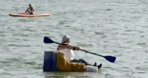 Он гребет двусторонним веслом, спокойно глядя вперед. Если присмотреться, то можно заметить, что на нем надет белый пояс — похоже, что это спасательный жилет. То есть мужчина ответственно подошел к вопросу и осознает риск утонуть из-за ненадежности дивана как плавсредства.