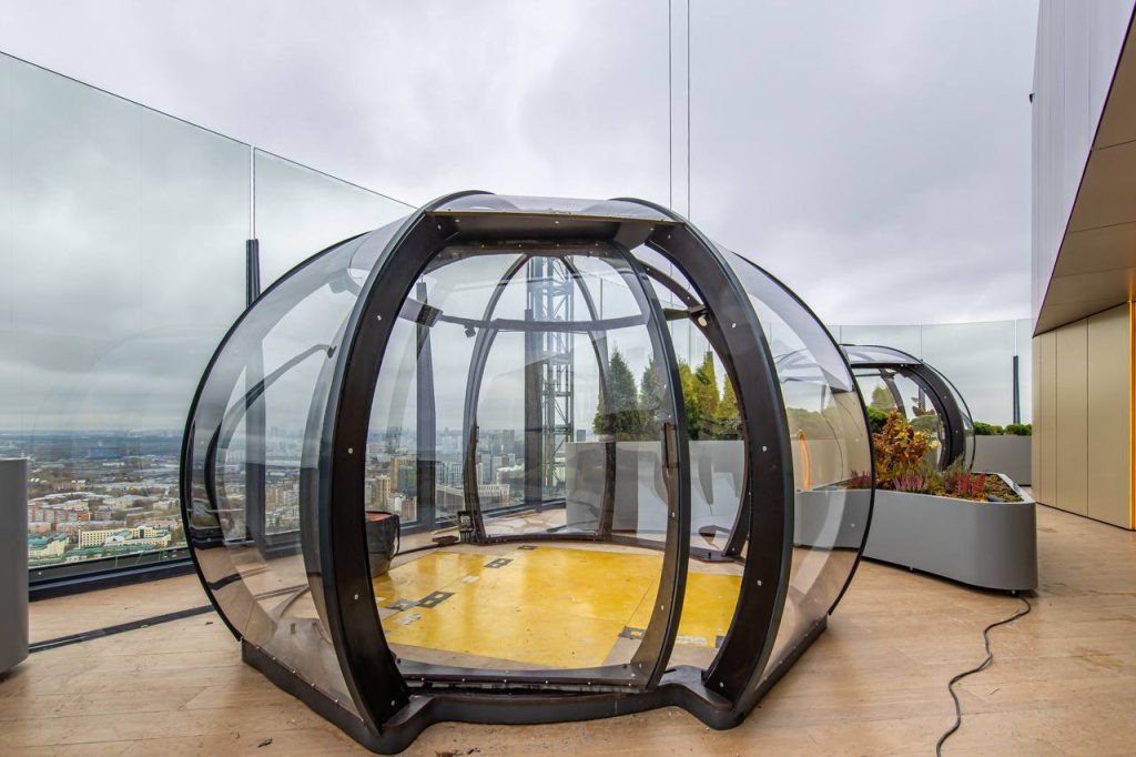 Фото опубликовал канал «Несобянин»: на крыше появились обещанные в проекте стеклянные беседки-иглу. Внутри — обогрев, вентиляция, освещение, вайфай, аудиосистема и зарядки для гаджетов.
