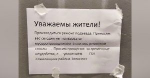 Фото объявления опубликовал телеграм-канал «Москва сейчас». В нем сказано, что в доме идет ремонт, поэтому пользоваться мусоропроводом временно нельзя.