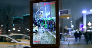 Это новый интерактивный формат наружной рекламы — экраны оборудованы камерами с двух сторон конструкции, в результате поверхности получаются условно прозрачными, что дает возможность видеть дополненную реальность без помощи смартфона или специальных очков.