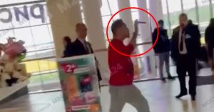 На записи, сделанной кем-то из сотрудников ТЦ на телефон, можно хорошо рассмотреть, как мужчину пытается утихомирить один из посетителей, но ничего не выходит, потому что хулиган начинает гнаться за ним с ножом. Но потом в кадре появляется другой прохожий, который с разбега бьет хулигана кулаком в голову, и тот падает. Интересно, что после падения к нему сбегаются сразу несколько мужчин-зевак и начинают бить его ногами.
