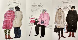 Такие диалоги удается подслушать Анне, пока она делает зарисовки. Получается такой районный комикс, который на самом деле мог бы случиться в любой части Москвы.