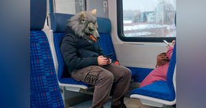 Снимок москвича в маске волка опубликовал телеграм-канал «Новости Москвы». При этом в остальном мужчина был одет вполне буднично: черный пуховик, коричневые штаны. Судя по вагону (это «Иволга»), дело было на одном из московских диаметров.