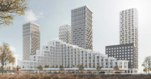 Здания будут отделаны фибробетонными панелями трех цветов, гладкими и с вкраплениями каменной крошки. Светлые оттенки отделки в сочетании с различной высотой зданий позволят новому району издалека выглядеть наподобие облаков, спускающихся к воде.
