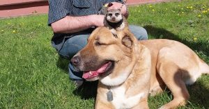 Гулял московский сурикат, к слову, не один, а в компании с алабаем. Судя по тому, что на одной из фотографий зверек спокойно сидит у грозного пса на голове, эти двое живут в одной квартире и хорошо знают друг друга.