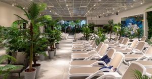 Аквакомплекс состоит из двух частей — открытой и закрытой. На улице действительно курорт: два бассейна и большая барная стойка, где зимой вряд ли будут пользоваться популярностью холодные коктейли. Вода в бассейнах, говорят, остается всегда теплой, но еще есть и купели с ледяной водой.