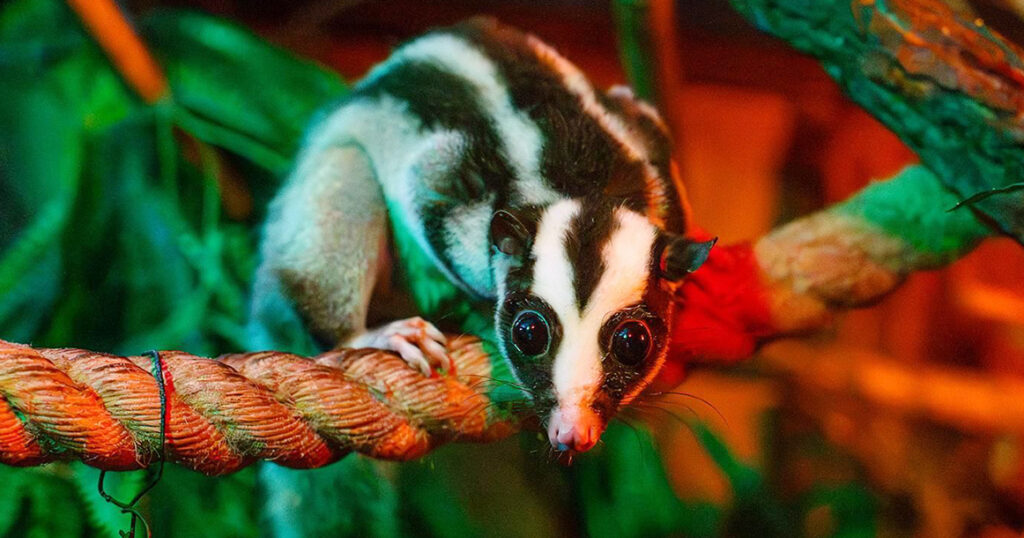 Речь о полосатом кускусе — древесном зверьке из тропических лесов Австралии и Океании. Почти всю жизнь он проводит на ветках, ловко карабкается благодаря цепкому хвосту и активен в темное время суток. Именно под это и подстроили экспозицию: днем в вольере приглушенный свет, а вечером, наоборот, «день», чтобы гости могли наблюдать за животными.