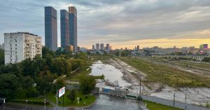 А потом в какой-то момент двор внезапно превратился в… оазис. После тропических ливней образовалось озеро. Сначала просто лужа, потом уже водоем, который каждый год возвращается. Утки переехали сюда из Екатерининского парка и явно чувствуют себя как дома. На фото эти черные точки как раз они, мои новые соседи.