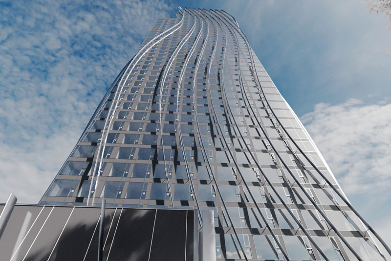 Фасады украсят декоративными алюминиевыми лентами овальной формы, окрашенными в серебристый цвет. Архитекторы предполагают, что эти «волны» будут обвивать здание, создавая игру света и иллюзию движения — такая отсылка к воде, омывающей скалу. Но нам кажется, что это больше похоже на дом в паутине.