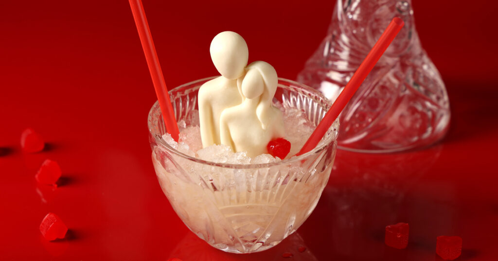Подача впечатляет: в большой хрустальный бокал с игристым опускают объемную фигурку обнимающейся пары из молочного шоколада. Судя по фото, влюбленные принимают ванну: прозрачный хрусталь, пузырьки, ледяная крошка вокруг. Бокал подают сразу с двумя трубочками, так что пробовать нужно строго вдвоем.
