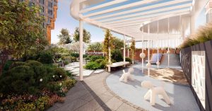 Локация для гостиницы, мы сразу поняли, не самая удачная, но не сказать, что для жилого проекта бизнес-класса, каковым себя позиционирует Oro, она подходит лучше: здание построят на месте бывшей АТС у ревущего Третьего транспортного кольца. Но будет в этом проекте и островок спокойствия — двор-сад от архитектурного бюро Gafa. Кажется, так должен выглядеть двор здорового человека: без машин (парковка предусмотрена под землей), с озеленением и красивой вечерней подсветкой, уличной мебелью, современной детской площадкой (на которой почти что арт-объекты — скульптуры собак) и навесом над ней.