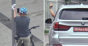 В интернете появились фотографии, на которых мужчина на велосипеде демонстрирует неприличный жест столбам, на которых наклеены символы спецоперации. Как сообщает «Комсомольская правда», на фото запечатлен американский дипломат, капитан первого ранга Дэйл Сэмуэл. Также пишут, что тот же жест американец показывал и людям, которые его фотографировали.