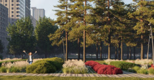 Территория парка будет отделена от проезжей части липами, между которыми высадят низкорастущие кустарники. В парке также посадят сирень, чубушник и три вида декоративных яблонь. Через всю длину парка пройдут массивы из гортензии и спиреи и цветники из разнообразных луговых трав.