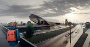 Судя по рендерам, павильон, который расположится в районе Коммунарки, воплощает фантазии архитекторов о далеком будущем. Плавные формы сверху напоминают то ли суперскоростной поезд, то ли звездолет.