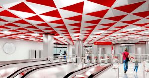 Впрочем, проект станции выглядит весьма запоминающимся и без 160-метрового панно. Дело в том, что «Яхромская» будет оформлена в ярких красно-белых цветах, словно на радость фанатам «Спартака». Потолок вестибюлей станции покроют красными треугольниками, вписанными в белые квадраты. А непосредственно зал станции и вовсе будет состоять из чередования белой и красной полос.