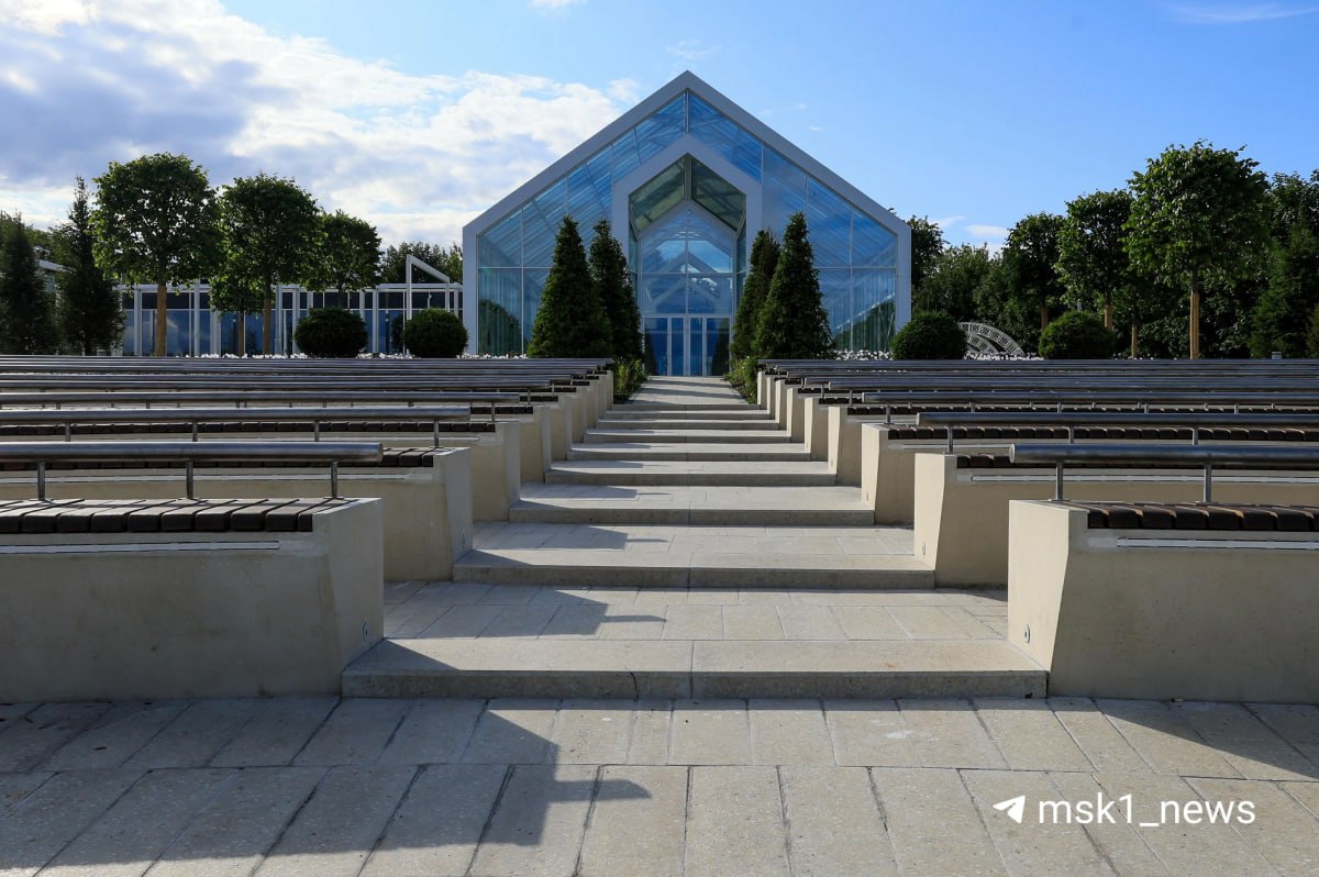 Все сделано в лучших традициях московской урбанистики последних лет: вдоль берега выложены цветы, проложены пешеходные и велодорожки, ну и, разумеется, не обошлось без цветной плитки. Ближе к станции «Кленовый бульвар» установлены павильоны из стекла и металла, а дорожки украшены декоративными арками. Помимо обычных лавочек установлены трибуны, очевидно, для проведения всевозможных летних активностей.