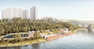 Проект предполагает, что на набережной появятся вымощенные дорожки для пешеходов и бегунов, малые архитектурные формы — лавочки в виде пеньков — и павильоны с кафе и прокатом. Отдельные дорожки сделают для велосипедистов, что логично — в районе и так довольно сильно развита велоинфраструктура. Недалеко от железнодорожного моста также обустроят смотровую площадку.