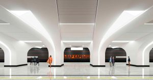 Кажется, новая станция будет выглядеть довольно строго и обойдется без особых украшательств. Серебристые путевые стены с оранжевыми вставками, массивные колонны по центру зала, геометрический потолок. Интересно сделано освещение: светильники тянутся по колоннам практически от пола до потолка.