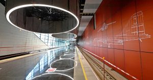 Она готова более чем на 90%: в вестибюле уже можно увидеть световые конструкции в виде турбин самолетов и графические изображения на одной из стен, которые расскажут об истории отечественного авиастроения.