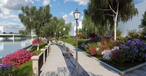 На показанных изображениях видно, что пешеходная часть набережной будет довольно узкая, но красивая — с обилием зелени и цветов, фонарями, стилизованными под старину, велодорожкой и изящными лавочками. Но наиболее интересно то, что помимо обычной прогулочной дорожки появится еще и спуск к воде (своеобразный причал), на котором под навесами разместят круглые столы — то ли просто места отдыха, то ли там хотят открыть кафе.