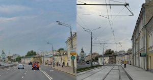 «Было: четыре автополосы вдоль сохранившейся застройки. Стало: две автополосы, разделительный зеленый газон (деревьев бы туда) и трамвайные линии», — пишет телеграм-канал «Москва. Детали», опубликовавший фотографии.