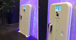 А работать все будет следующим образом. Вы заходите после работы в подъезд родного дома (или, допустим, в гости) и становитесь к аппарату (прямо в одежде, конечно). Затем проводите несколько бесконтактных манипуляций, в ответ на которые машина обдает вас антисептическим средством, превращенным в мелкодисперсный холодный туман. Помимо этого аппарат измеряет температуру — в него встроен термометр, тоже бесконтактный. Так что если кто-либо задумывался, как мы будем жить и бороться с вирусом в Москве в ближайшие несколько лет, то пожалуйста, компания представила свой сценарий развития событий.