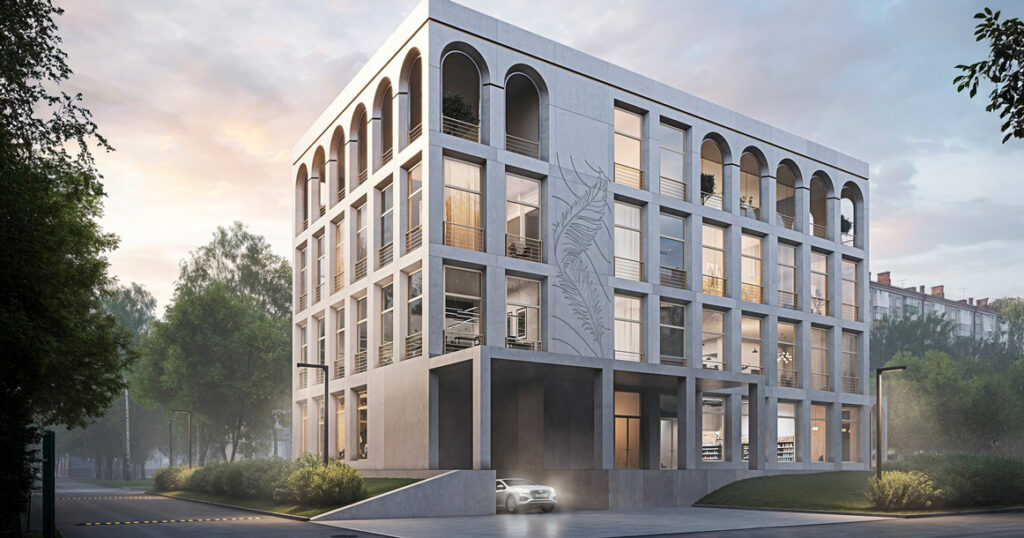 Дизайн здания решен в современном минималистичном стиле с отдельными архитектурными элементами из неоклассики. Одним из ключевых акцентов, по задумке авторов, станут большие выразительные белые арки.