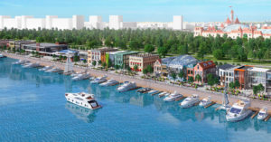Проект благоустройства участка площадью 82,7 гектара уже утвержден властями. Если не всматриваться в задний план рендера, а концентрироваться только на том, что у воды, можно даже подумать, что это какой-то новомосковский Амстердам.