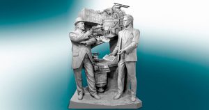 По задумке две фигуры представляют собирательный образ предпринимателя-мецената из разных эпох.