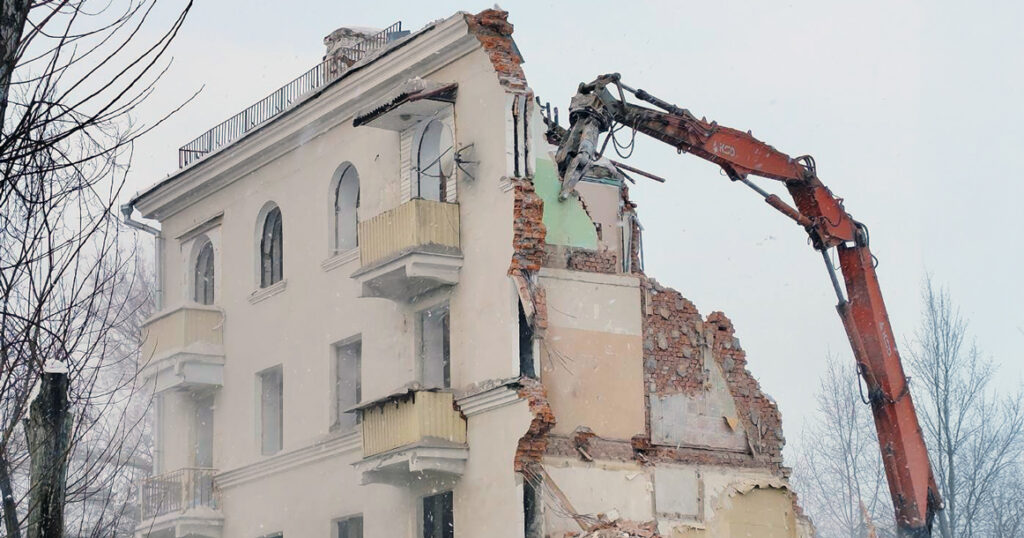 Фотографии сноса опубликовал телеграм-канал «Изнанка Москвы». На снимках видно, как экскаватор с гидроножницами методично крушит один из домов. Светлый фасад с арочными окнами вскрыт, видны кирпич, перекрытия и цветные стены бывших квартир. На заднем плане — современные высотки, впереди — груды кирпича. Все довольно наглядно, картина выглядит грустно.