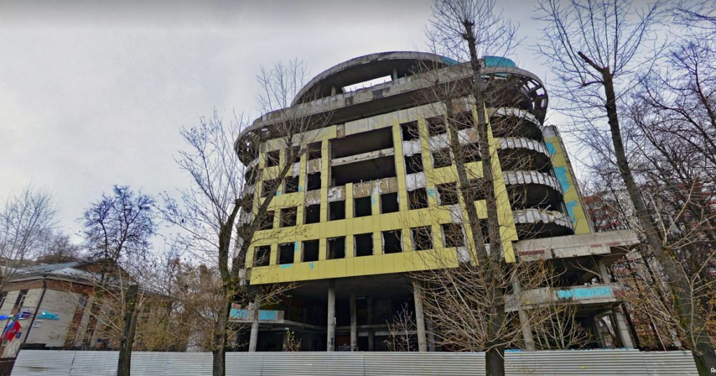 Знаменитый долгострой расположен у выхода из метро №3. Больше десяти лет назад здесь планировали возвести культурный центр с административными зданиями, но в 2015 году застройщик был признан банкротом. И с тех пор Профсоюзную улицу «украшает» это страшное здание.