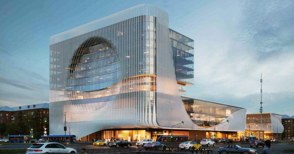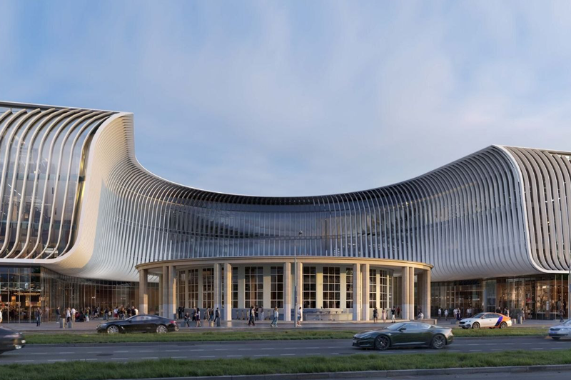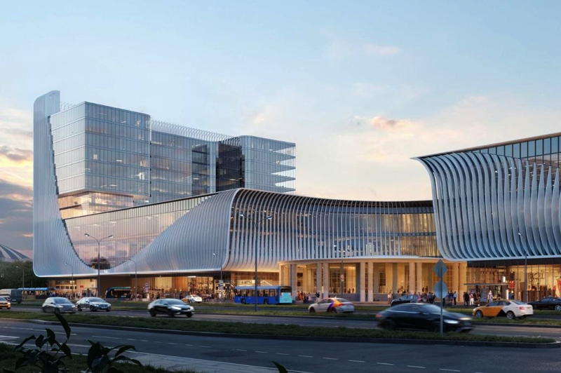 По картинкам новый комплекс выглядит так, будто его слегка расколбасило: один корпус повыше, стеклянный, с большой круглой дырой посередине, словно фасад слегка продавили внутрь. Второй ниже и шире, плавно загибается и фактически обнимает вход в метро. Все это обшито стеклом и белыми вертикальными ребрами, из-за которых здание выглядит волнистым.