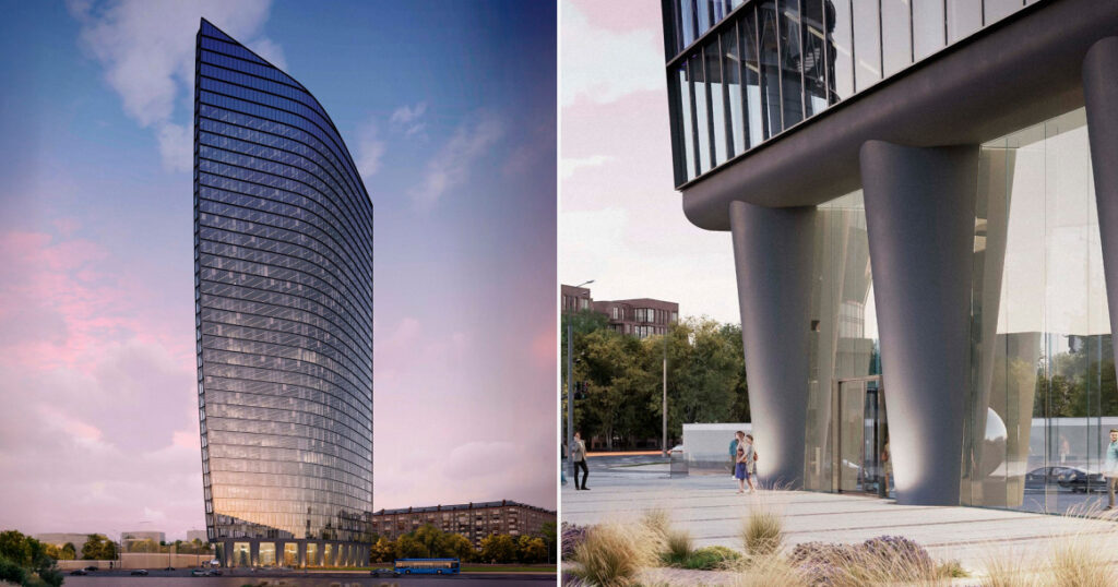 В новой версии 34-этажный деловой центр рядом с «Олимпийским» тянется вверх на 178 метров, но вместо сужающегося кверху объема — плавно изогнутая башня, которая расширяется с каждым этажом. Стеклянный фасад собран горизонтальными лентами, из-за чего здание читается не как вертикальный клин, а как такой «текучий» объем. Изменился и первый уровень: башню приподняли над землей и поставили на опоры — своеобразные ножки. Под зданием как будто остается открытое пространство, заполненное витринами.