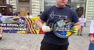 Вообще говоря, этот митинг сильно напоминает акцию, прошедшую недавно у стен посольства США — такой же длинный баннер, который держат несколько мужчин (на этот раз полотно шестиметровое с надписью «Руки прочь от Приднестровья! За мирную и нейтральную Молдову!» и флагами США, Румынии, НАТО, Молдавии, Приднестровья и России), те же небольшие листовки в руках остальных активистов, то же бездействие полиции, представители которой спокойно наблюдают за происходящим.