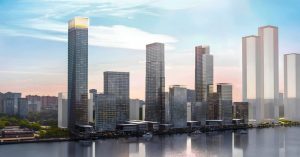 В целом в зданиях будут не только квартиры, еще запланированы офисы и коммерческие помещения. На рендерах видно благоустроенную набережную — вдоль нее и планируют разместить торговые небоскребы. Все три башни обещают построить в 2027 году.
