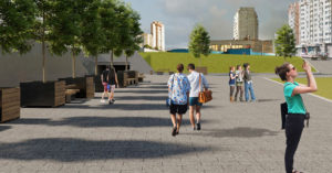 Опубликованные рендеры обещают по дороге от метро к усадьбе плитку, деревья в кадках и деревянные скамейки.
