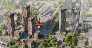 Раньше высотной доминантой района была Шуховская башня — памятник советского рационализма. Но теперь, как можно заметить по визуализации, в районе вырастет еще с десяток небоскребов похожей высоты. На фоне виден также высотный проект на месте бизнес-парка «Шаболовка, 31», расположенного севернее Нечаевской богадельни. Его тоже будут сносить. В мае «Железобетонный замес» сообщал, что застройщик объединил несколько участков на территории и уже начинает стройку.