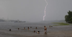Кто-то, пользуясь случаем, решил устроить заплыв по улицам. В соцсетях распространилось видео из Богородского, в котором мужчина в одних шортах «плывет» (на самом деле ползет по-пластунски) по затопленной улице. Видно, что там довольно мелко — в Москве образовались и более глубоководные места, скажем, 1-я Хуторская улица: затопило если не по пояс, то по колено. Или, скажем, у «Багратионовской», где таксисту пришлось залезть на крышу своего утонувшего автомобиля.
