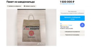 Артефактом из прошлого стать нынче довольно просто — достаточно напоминать собой о досанкционной эпохе, а в некоторых случаях даже хранить ее запахи. Всеми этими свойствами, видимо, обладает бумажный пакет из McDonalds, выставленный на сайте объявлений в разделе «Коллекционирование». Цена лота максимально неадекватная — 1,5 млн рублей, впрочем, владелец предлагает торг для настоящих ценителей, желающих окунуться в воспоминания.