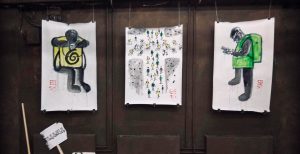 Свешенные c сиденья натруженные ноги новых городских персонажей — курьеров «Яндекс.Еды» и Delivery Club. Простые валенки, скромно выглядывающие из-под затейливого арт-объекта. Просто ноги, торчащие из стены. Сваленные в углу обрывки лозунгов, с которыми отходили и отстояли себе ноги участники городских протестных митингов. Живопись, графика, инсталляции, видеоарт, арт-объекты — все они собраны здесь по одному формальному принципу, придуманному кураторами из объединения Blumen: все о ногах.